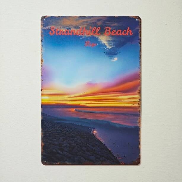 VINTAGE DESIGN: Beautiful metal sign featuring Strandhill Beach with a stunning sunset ocean scene, perfect for coastal-themed decor